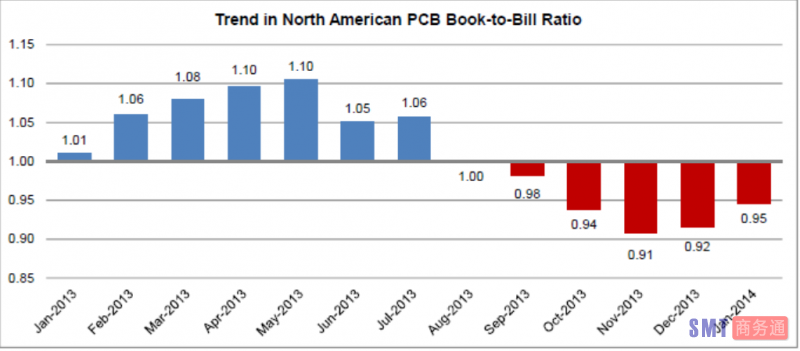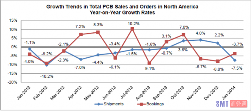2014年1月份北美地區(qū)PCB行業(yè)的總出貨量與去年同期相比下降了7.5%,訂單量同比下降3.7%。與2013年12月份相比,1月份的銷售量下降16.9%,訂單量下降7.0%,此數(shù)據(jù)基于相同樣本的比較。